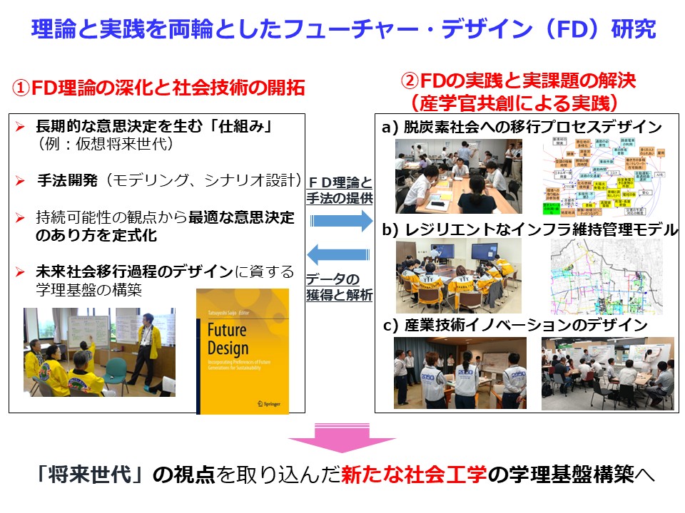 現代社会は、気候変動や資源エネルギー問題、インフラ維持管理の問題、産業技術イノベーションなど、様々な長期的課題に直面しています。これらは、将来世代にも関わるサステイナビリティ問題だと言えます。将来世代を考慮した持続可能な意思決定と行動を生み出すための新たな社会の仕組みや社会システムが求められる所以です。本拠点では、将来世代に持続可能な社会を引き継ぐための社会の仕組みや社会システムをデザインする「フューチャー・デザイン」に関する研究および産学官共創を通じた実践を進めています。フューチャー・デザインの理論や方法論を工学的に深化させるとともに、自治体や政府、産業界などのステークホルダーとの共創を通じて、フューチャー・デザインの理論・方法論に基づく、持続可能社会形成に関わる実践を進めています。実践領域としては、資源エネルギー、カーボンニュートラル、まちづくり、防災、産業界の研究開発・技術イノベーション戦略の立案など様々なものがありますが、昨今では特に1)脱炭素社会への移行プロセスのデザイン、2)レジリエントなインフラの維持管理モデル構築、3)産業技術イノベーションのデザイン、に取り組んでいます。本拠点では、フューチャー・デザインの理論深化と応用実践を両輪として進めることによって、「将来世代」の概念を明示的に取り入れた新しい社会工学の基盤構築を目指します。