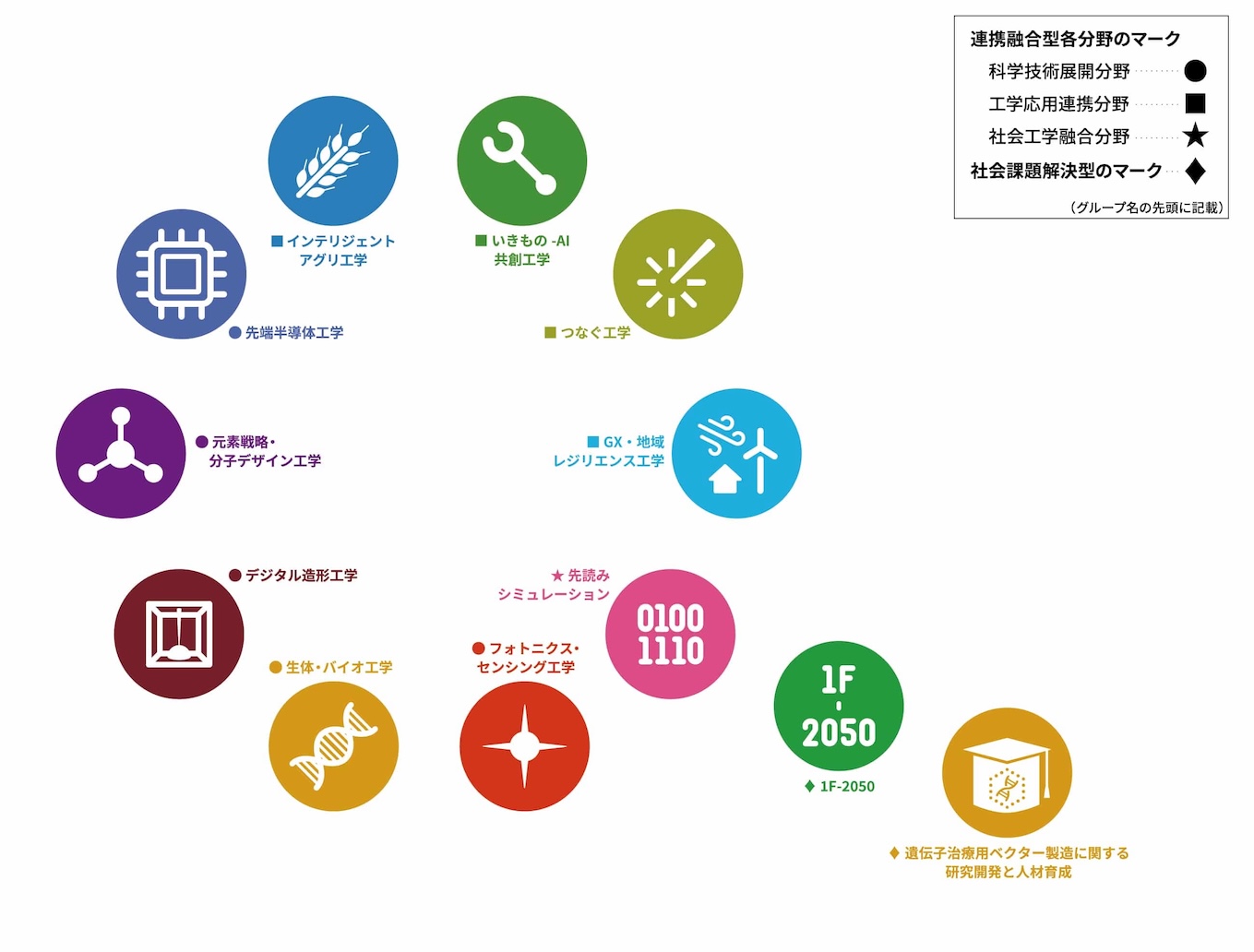 以下に掲載するロゴマークは、連携融合型10グループのアイコンと社会課題解決型2グループのアイコンを虫眼鏡の輪郭を模して配置し、虫眼鏡全体で「未来社会のために探求する」コンセプトを表現しています。