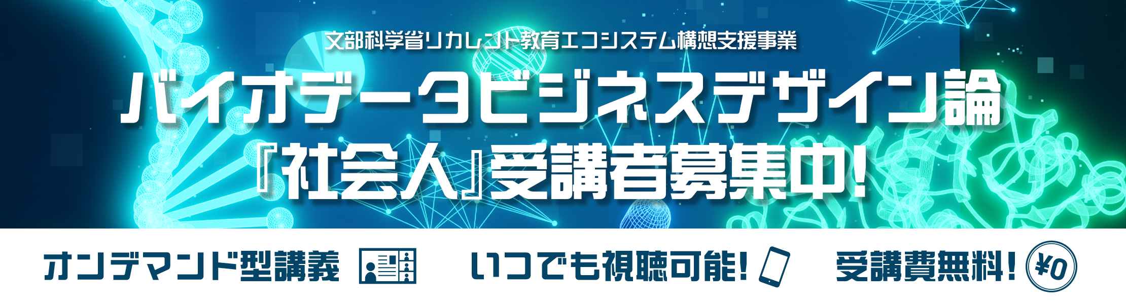 社会人向け『バイオデータビジネスデザイン論』 は、文部科学省「リカレント教育エコシステム構築支援事業」へ大阪大学大学院工学研究科が提案した「Industry on Campus 型リカレント教育エコシステム構想」をもとに社会人向けリカレント教育を目的としたプログラムです。